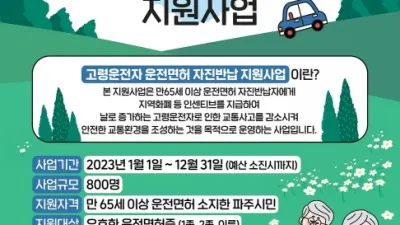 파주시, 고령운전자 운전면허 자진반납 실시…올해 800명 대상 - 운전면허 자진 반납 어르신에 보상금 10만 원 지원 파주시는 고령운전자의 교통사고 발생률을 줄이기 위해 고령운전자 운전면허 자진반납 지원사업...