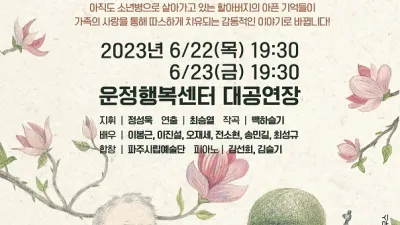 파주시립예술단, 6월 호국보훈의 달 맞아 앙코르 무대 마련 파주시는 6월 22일부터 23일까지 운정행정복지센터 대공연장에서 ‘우리 할아버지는 열다섯 살 소년병입니다’ 공연을 2회에 걸쳐 개최한다. ...