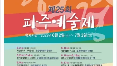 음악회부터 미술대회까지…제25회 파주예술제 6월 2일 개막 - 파주시 전역서 예술축제 열린다       파주시는 6월 2일부터 7월 3일까지 제25회 파주예술제를 개최한다.   파주시가 주최하고 (사)한국예술문화단체총연합...
