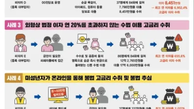연 이자율 최고 3만 8천274%, 살인적 고금리 수취한 사채업자 일당 검거 - 전국 특사경 검거 범죄 중 역대 최고 불법 고금리 강취   ○ 김광덕 경기도 공정특별사법경찰단장, 16일 ‘불법 사금융 기획수사’ 결과 발표 - 1월부터 &l...