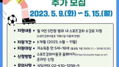 파주시, 스포츠강좌이용권 대상자 5월 15일까지 추가 모집 - 저소득층 만 5~18세 월 9만 5천 원 지원…스포츠복지 구현 파주시는 ‘2023년 스포츠강좌이용권 지원사업’ 대상자를 오...