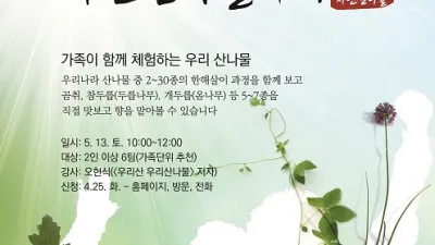 파주중앙도서관, ‘나는 자연산나물이다’체험 강연 개최 - 가족이 함께하는 우리 산나물 체험         파주중앙도서관은 5월 13일 오전 10시에 가족이 함께 듣는 ‘나는 자연산나물이다’ ...