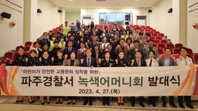 파주경찰서, 녹색어머니 연합회 발대식     파주경찰서(서장 이재성)는 27일 경찰서 강당에서 ‘어린이 교통사고 예방을 위한 녹색어머니회 발대식을 개최했다.   이날 발대식에는 파주시청, 교육청, 경찰 및 33개 초등학교 녹색어머니...