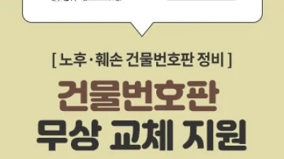 도시미관 향상…파주시, 노후 건물번호판 무상 교체 정비       파주시는 노후화된 건물번호판 무상 교체 정비를 추진한다고 밝혔다.   시는 도로명주소 시행초기(2011년) 처음 설치된 건물번호판이 장기간 햇빛에 노출돼 ...