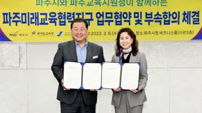 파주시-파주교육지원청 미래교육협력지구 업무협약 체결 - 지역 중심 미래교육의 새로운 도약 이뤄낼 것 파주시는 8일 파주교육지원청과 미래교육협력지구 업무협약 및 2023년 부속합의를 체결했다고 밝혔다. &ls...