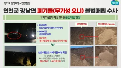 “농지에 좋은 흙 준다고 했는데 폐기물 폭탄”… 경기도 특사경, 연천에서 덤프트럭 63대분 폐기물 불법매립 적발 ○ 무분별한 농지 성토 근절을 위해 도․연천군 합동으로 단속 - 폐기물 불법매립 1건, 비산 먼지 불법행위 8...