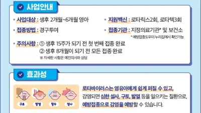 파주시, 로타바이러스 무료 예방접종 3월부터 시행 - 위탁의료기관에서 생후 2~6개월 영유아 접종 파주보건소는 3월 6일부터 생후 2~6개월 영유아를 대상으로 로타바이러스 무료 예방접종을 시행한다고 밝혔다. 로타바이러스...