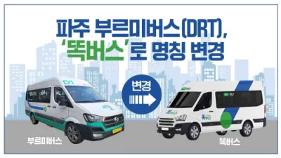 파주 부르미버스(DRT),‘똑버스’로 명칭 변경       파주시(시장 김경일)는 파주 부르미버스(DRT: 수요응답형버스) 명칭이 ‘똑버스’로 변경된다고 밝혔다.   &lsquo...