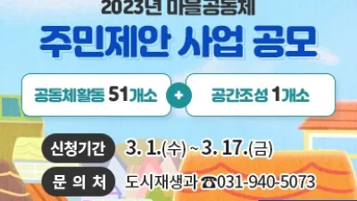 파주시 마을공동체 주민제안 사업 공모...3월 17일까지 - 공동체활동 분야 51개소, 공간조성 분야 1개소 지원 파주시(시장 김경일)는 3월 17일까지 2023년 마을공동체 주민제안 사업에 대한 공모를 실시한다. &n...