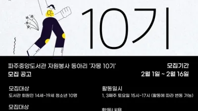 파주중앙도서관, 청소년 자원봉사동아리‘자몽’10기 모집 - 파주시 거주 청소년 10명 모집...2월 16일까지 접수 파주중앙도서관(관장 이인숙)은 오는 16일까지 청소년 자원봉사동아리 ‘자몽&rsqu...