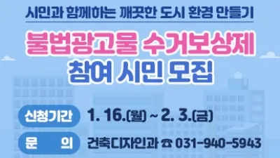 파주시,‘불법광고물 수거보상제’참여 시민 모집 - 오는 2월 3일까지 접수...시민과 함께 깨끗한 도시 환경 만들기       파주시(시장 김경일)는 오는 2월 3일까지 깨끗한 도시 환경을 만들기 위한 '불법광고물...