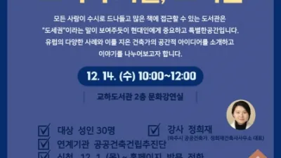 파주시 교하도서관, 다양한 지역연계 프로그램 추진 파주시 교하도서관(관장 이현주)은 지역 내 다양한 유관기관과 협력해 도서관의 인프라를 적극적으로 활용하고, 지역사회의 발전과 지역주민을 위한 프로그램을 제공하고 있다. ...