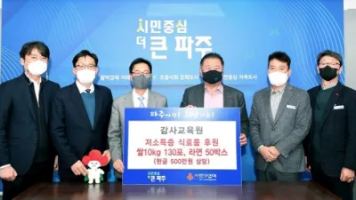 감사교육원, 파주시에 식료품 등 취약계층 지원 파주시(시장 김경일)는 8일 감사교육원(원장 조성은)에서 파주시 취약계층을 위해 현금 500만원 상당의 쌀 1,300kg과 라면 50박스를 전달받았다고 밝혔다. 파주시에 소재한 감사교육...