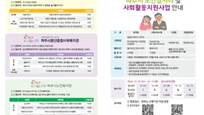 파주시, 2023년도 노인 일자리 및 사회활동 지원사업 참여자 모집     파주시(시장 김경일)는 오는 7일부터 13일까지 2023년도 노인 일자리 및 사회활동 지원사업 참여자 2,933명을 모집한다.   당초 보건복지부의 노인 일자리 사업 ...
