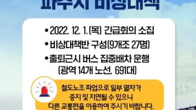 파주시, 철도파업 대비 비상대책 마련 - 비상대책반 구성 및 대시민 홍보 총력 - 출퇴근시 버스 집중배차, 광역버스 14개노선 691대 투입 파주시(시장 김경일)는 12월 2일 첫차를 시작으로 철도교통 노조의 총파업이 예고됨에 따라 긴급회의를 열고 시민 불...