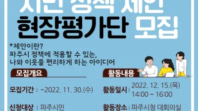 파주시, 제안‘현장평가단’파주시민 30명 모집 형태 평가단...12월 15일 본심사 현장평가 역할 파주시(시장 김경일)는 ‘더 큰 파주 시민 정책 제안 공모전’의 본심사가 12월 15일에 개최됨에 따라...
