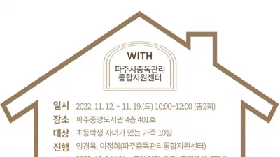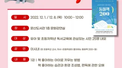 파주시 문산도서관, ‘부모독서교실’강좌 운영 - 우리 아이 문해교육, 도서관에서 함께 고민합니다. 파주시 문산도서관은 11월 17일부터 12월 8일까지 ‘2022년 부모독서교실’ 강좌를 운영한다. 이번 강좌는 양육...