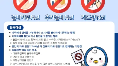파주시, 지역화폐(파주페이) 부정유통 일제단속 실시 - 10월 31일부터 11월 18일까지...건전한 지역화폐 유통질서 확립 파주시(시장 김경일)는 오는 31일부터 11월 18일까지 파주시 지역화폐(파주페이) 부정유통 방지 및 근절...