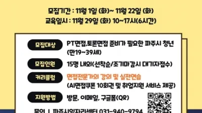 파주시, PT·토론 면접 마스터 프로그램 참여자 모집 - 상호토론 및 발표로 실전 면접 완벽 대비 파주시(시장 김경일)는 11월 1일부터 22일까지 ’PT·토론 면접 마스터 프로그램‘의...