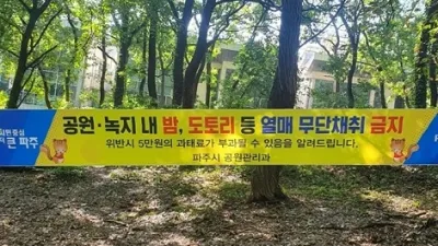 파주시, 공원 내 열매 무단채취 행위 집중 단속 - 오는 11월까지 집중 단속 기간 운영 파주시(시장 김경일)는 오는 11월까지 공원 내 열매 무단채취 행위 집중 단속 기간을 운영한다. 「도시공원 및 녹지 등에 관한 법...