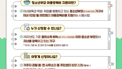 파주시, 청소년부모에 자녀 1인당 월 20만원 지원 파주시(시장 김경일)는 자녀 양육과 학업·취업을 병행하는 청소년부모 가구에 자녀 1인당 월 20만원의 양육비를 지원하는 ‘청소년부모 아동양육비 지원사업’을 시행하고 있다. ...