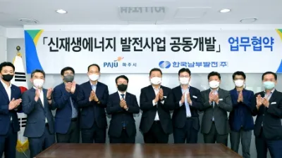 파주시, 한국남부발전과 신재생에너지 발전사업 공동개발 업무협약 체결 파주시(시장 김경일)는 ‘활력경제 미래도약’이라는 시정전략 추진을 위해 에너지 신사업 발굴을 위한 발판을 마련했다. 시는 지난 2일 한국남부발전과 파주시 미래에너지 보...