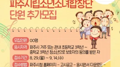 2022 파주시립소년소녀합창단 단원 공개 모집 파주시(시장 김경일)는 오는 14일까지 꿈나무 음악가를 육성하기 위해 ‘파주시립소년소녀합창단 단원’을 공개 모집한다. 시는 이번 모집을 통해 능력 있는 학생들을 조기에 발굴하고 공연 활동과...