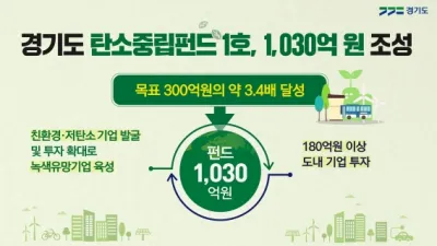 경기도형 녹색금융 실천 첫발‥1,030억 규모 ‘탄소중립펀드 1호’ 조성 녹색 혁신에 앞장서고 있는 민선 8기 경기도가 올해 총 1,030억 원 규모의 ‘경기도 탄소중립펀드 1호’ 조성을 완료하고, 탄소중립 분야 유망 기업에 ...