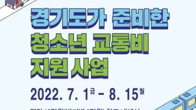 ‘경기도 청소년 교통찬스’ 2022 상반기 청소년 교통비 지원사업 접수 경기도가 청소년의 교통비 부담을 덜어주기 위해 ‘교통찬스’를 제공한다. 경기교통공사(사장 직무대행 이회수)는 ‘2022년도 상반기 청소년 교통비...