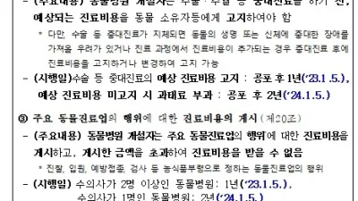 경기도 “5일부터 반려동물 중대 진료 전, 설명·동의 절차 밟아야” 강조 경기도는 개정 「수의사법」의 첫 조치인 ‘반려동물의 수술 등 중대진료에 관한 사전 설명 및 서면 동의 의무화’가 올해 7월 5일부터 시행됨에...