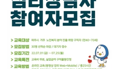 파주시,‘노인심리상담사 자격증 과정’참여자 30명 모집 파주시는 오는 7월 1일부터 25일까지 중장년 및 시니어층을 대상으로 ‘노인심리상담사 자격증 과정’ 참여자 30명을 모집한다고 밝혔다...