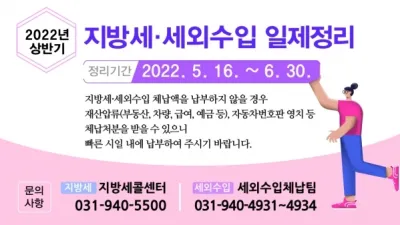 파주시, 상반기 지방세·세외수입 체납액 일제정리기간 운영 파주시는 16일부터 6월30일까지 강력한 체납처분 및 행정제재를 통해 지방세 및 세외수입 체납액을 집중 정리 한다고 밝혔다.   4월말 기준 파주시 과년도 지방세 체납액은 340억원, 세외수...