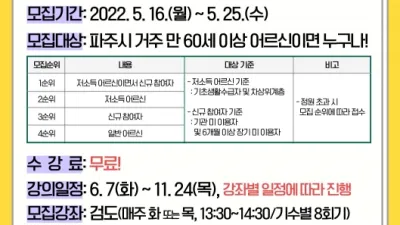파주시, 어르신 문화·체육 이음터 사업 「마을배움터」참여자 모집   파주시는 파주시노인복지관(관장 육언태)에서 16일부터 오는 25일까지 관내 어르신들에게 다양한 여가문화 활동 기회를 제공하기 위한 「마을배움터」 참여자를 모집한다고 밝혔다. &nb...