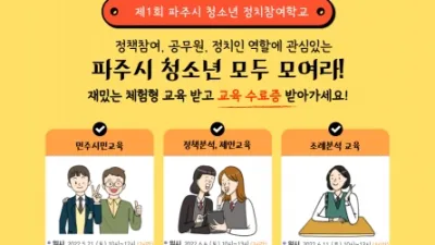 제1회 파주시 청소년 정치참여학교 개강 - 파주시 청소년 모두 모여라!- 파주시는 청소년 사회참여 교육을 위해 “제1회 파주시 청소년 정치참여학교” 참가자 90명(각 차수별 30명)을 오는 20일까지 모집한다고 밝혔다.   청소년 정치참여...