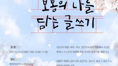 행복어린이도서관, 나를 알리는 취향적 글쓰기 운영 파주시는 행복어린이도서관(문산읍 행정복지센터)에서 오는 24일까지 3회에 걸쳐 「당신의 취향」이라는 주제로 보통의 나를 담는 글쓰기 강좌를 운영한다고 밝혔다.   이번 강좌는 성인 20명을 대상으로 「내향적이지...