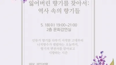 파주시 교하도서관, 조향사 초청 코로나19로 잊었던 향의 감각 깨운다 파주시 교하도서관(과장 이현주)은 5월 교하도서관 도서 전시 주제인 「감각의 아카이브, 향기」 전시 연계 강좌로 인문학을 접목한 체험 강연을 진행한다고 밝혔다.   교하도서관 전시 연계 강좌...