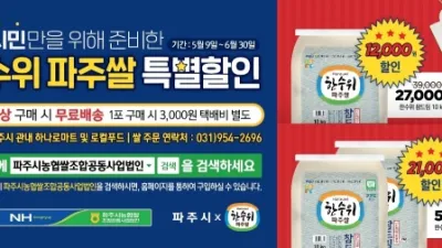 파주시, 파주쌀 소비촉진 특별 할인 행사 추진 파주시는 파주시농협쌀조합공동사업법인과 함께 파주쌀 소비촉진 특별 할인행사를 5월 9일부터 6월 30일까지 실시한다고 밝혔다. 이번 행사는 전국전인 풍작으로 인한 쌀 가격 하락 및 쌀 소비량 감소 등의 어려움을 ...