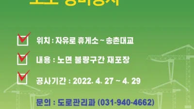 파주시, 위임국도 재포장공사 추진 파주시(시장 최종환)는 쾌적한 도로환경 조성을 위해 관내 위임국도 2개 노선(국도1호선 통일로, 국도77호선 자유로) 일부 구간에 대한 도로 재포장 공사를 한다고 밝혔다. 통일로와 자유...