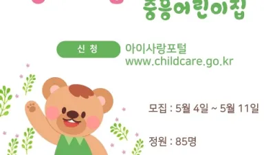 파주시, 시립운정중흥어린이집 6월 개원 원아 85명 모집 파주시(시장 최종환)는 6월 7일 시립운정중흥어린이집이 개원할 예정이라고 밝혔다. 이번에 신설 예정인 어린이집은 초롱꽃마을8단지 중흥S클래스 내 연면적 ...