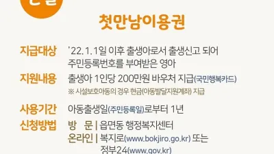 파주시, 출산지원확대 출산축하금·첫만남 이용권 지급 파주시(시장 최종환)는 출산 장려 및 아이 키우기 좋은 환경을 만들고자 기존에 지급하는 출산축하금과 함께 ‘첫만남 이용권’을 4월부터 지급해 출산...