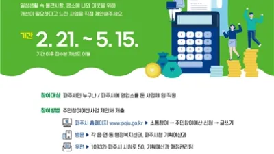 파주시, 주민참여예산 제안사업 공모 파주시(시장 최종환)는 2월 21일부터 5월 15일까지 2023년도 예산반영을 위한 ‘주민참여예산 제안사업’ 신청을 받는다. 주민참여예산은 예산 과정에 시민들의 실질적인 참여...