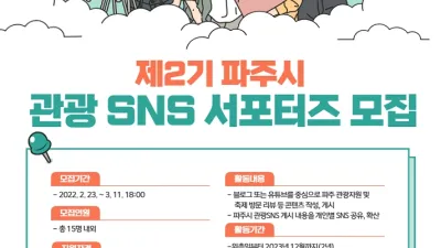 파주시, 제2기 관광 SNS 서포터즈 모집 - 시민이 만드는 파주 관광 파주시(시장 최종환)는 시민이 참여하는 파주 관광 홍보마케팅을 추진하기 위해 2월 23일부터 3월 11일까지 ‘제2기 파주시 관광 SNS 서포터즈&r...
