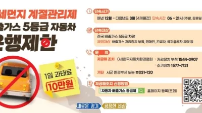 2021-11-29 01:28:3612월부터 배출가스 5등급 차량 경기도에서 운행 못해. 위반시 과태료 10만 원