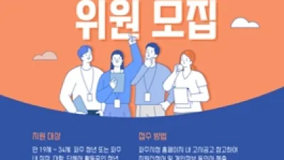 파주시,‘청년정책협의체’위원 공개모집 파주시가 청년들의 능동적인 사회참여 기회를 보장하고 소통을 통한 수혜자 중심의 청년정책 발굴을 위해 ‘청년정책협의체’ 위원을 공개모집 한다.  ...