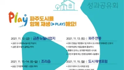 파주형 도시재생 대축전(성과공유회) 개최 - 지난 3년간 도시재생의 성과·전망 주민들과 나눈다 파주시(시장 최종환)가 지난 3년간 도시재생 사업의 성과와 전망을 나누는 ‘2021 파주시 도시재생 대...