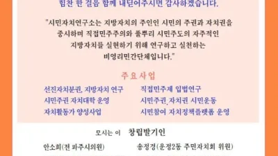 선진 지방분권 지방자치, 풀뿌리 직접민주주의 실현 목표 비영리 ‘파주673시민자치연구소’ 출범 8월 창립발기인대회 거쳐 오는 11월10일 창립식 개최 지방자치 부활 30주년, 10월29일 제9회 지방자치의 날을 맞아, &l...