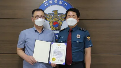 2021-08-13 01:06:51어르신을 가로막은 경찰관, 대체 왜? -파주경찰서, 아들 수술비 명목 보이스피싱 피해 예방 및 도움 준 택시 기사 감사장 전달