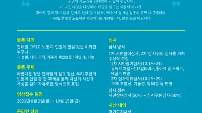 ‘노동존중’ 경기도, 우리시대 99% 전태일 위한 ‘99초 노동인권 영상제’ 공모 ○ 경기도, 전태일 열사 추모사업 일환으로 전태일 노동인권 영상 공모전 추진 - 8월 2일 ~ 10월 15일 ‘99초 전...