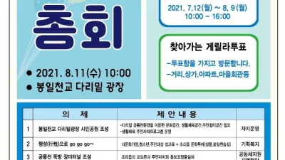 파주시 조리읍 주민자치회, 제1회 주민총회 개최 파주시 조리읍 주민자치회가 8월 11일 제1회 주민총회를 앞두고, 7월 12일부터 8월 10일까지 온·오프라인 방식으로 의제 선정을 위한 주민투표를 진행한다. ...