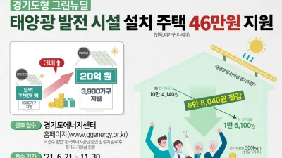 경기도, 단독주택에 태양광발전기 설치하는 대상가구에 46만원 지원 ○ 경기도형 그린뉴딜, 전력자립 10만 가구 프로젝트(주택태양광) 보조사업 시행 - 경기도 주택태양광 지원사업 공고(5.24~예산 소진시까지) - 경기도 주택태양광 선정 가구별 46만원 보조...